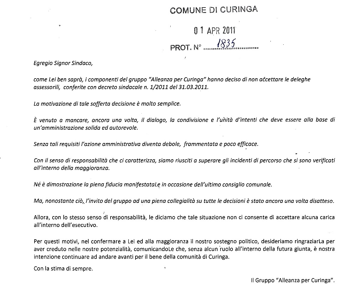 Il giorno successivo tutti i componenti del Gruppo “Alleanza per Curinga”, riunitisi per discutere sulla bozza del rinnovo di giunta, ma soprattutto sul modo di come ci era stata consegnata da parte del Sindaco, cioè senza alcuna discussione, sollevavano alcune note da porre ad una discussione collegiale, magari per il giorno seguente.